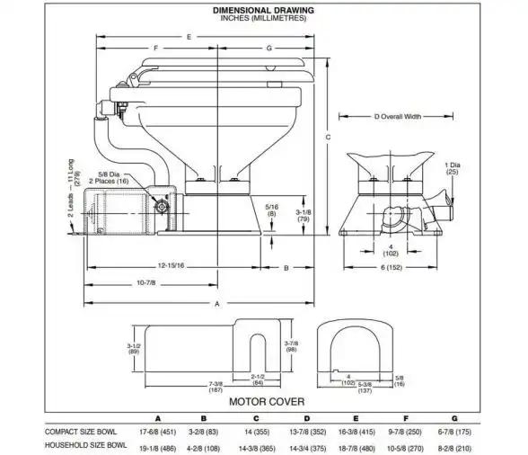 Se trata de un inodoro eléctrico de estilo tradicional con autocebador de hasta 1,2 m. Se puede descargar a través de una altura vertical máxima de 1,2 m y viene completo, con protector contra salpicaduras moldeado y un interruptor sencillo. Puede encontrarlo en tamaños de taza compacto o regular y además tienen el motor ubicado en la parte trasera de una base angosta, lo cual da una apariencia prolija desde el frente. Su control por pulsador simplifica la vida, tanto para usuarios nuevos, como marineros experimentados.