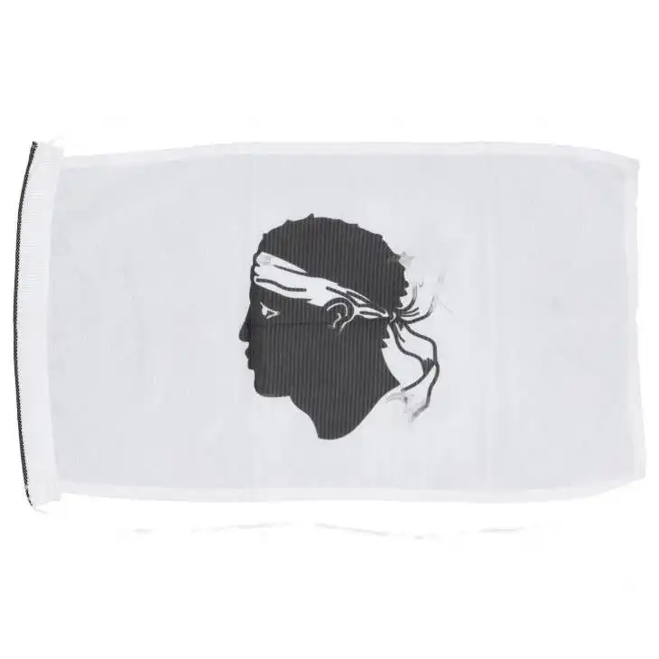 Bandera de Córcega con cabo para atarla a mástil u otros soportes. Disponible de calidad estándar y de estamina de poliéster, para medida de 75x50cm, que proporciona un tacto de algodón pero de gran calidad (marcadas con las siglas HQ).