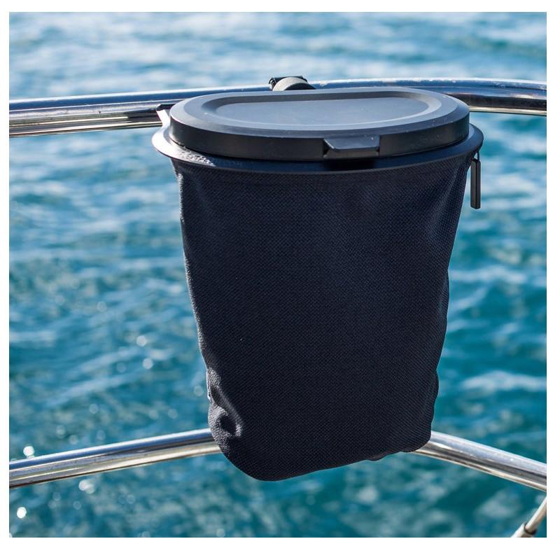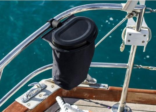 Este contenedor de basura flexible está hecho de botellas de PET recicladas y se puede colgar fácilmente en cualquier lugar a bordo con clips especificos.