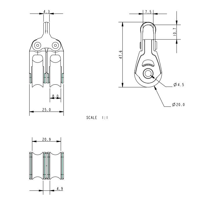 La A2022 es una polea pequeña de doble roldana, baja fricción y rápida rodadura. Es ligera y resistente, por lo que resulta ideal para embarcaciones de vela ligera, windsurf, kitesurf y cualquier otra actividad en la que se utilicen líneas de menor diámetro.