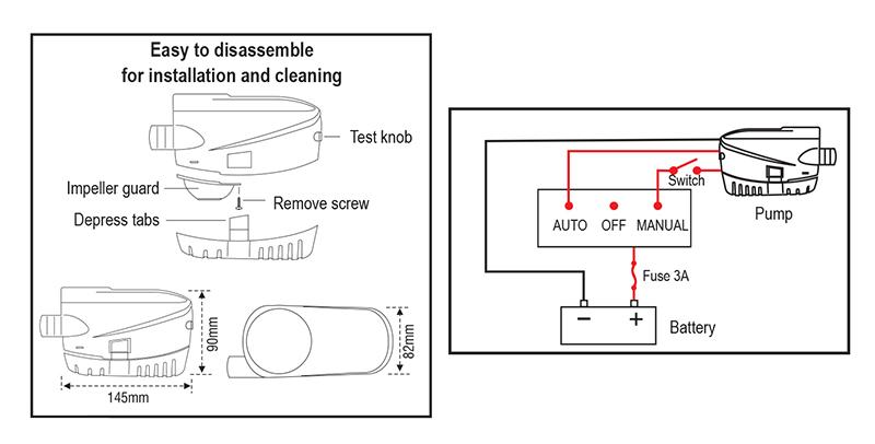 Esta bomba de sentina sumergible automática, combina calidad y facilidad de uso. Contiene un interruptor automático que activa o desactiva la bomba según sea necesario y evitando la quema del motor por uso en seco. Tiene capacidad para 600 Gph (2400 L/hora) por un tubo de 19 mm. Además un botón de prueba le informará si la bomba y el interruptor funcionan correctamente. Esrá fabricado en plástico ABS. La base se quita y pone por clips, lo que facilita su instalación y mantenimiento.