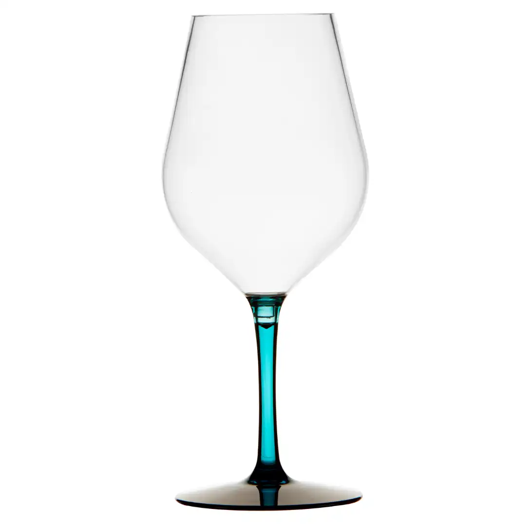 Set de 6 copas de vino con pie turquesa echas de metilestireno, un material resistente a los golpes y con el que evitaremos rayaduras.