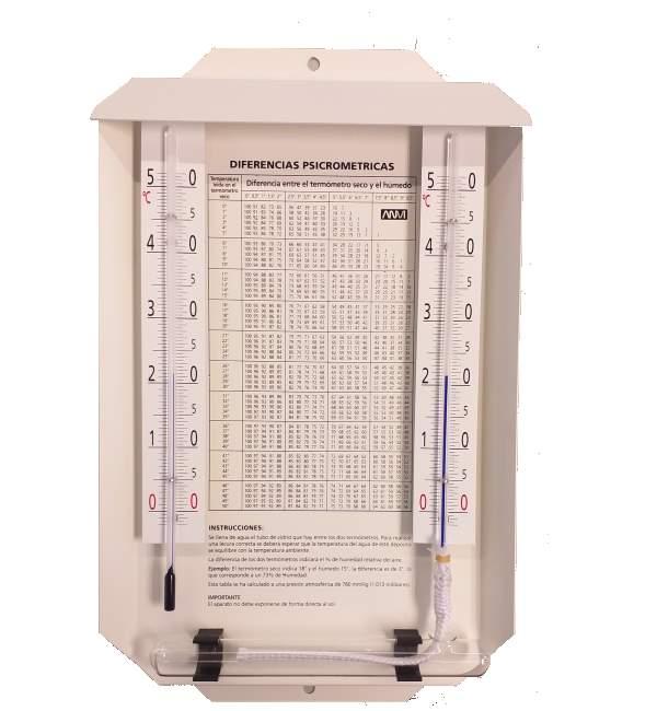 Psicrometro con tejadillo montado sobre soporte metálico pintado en color blanco.